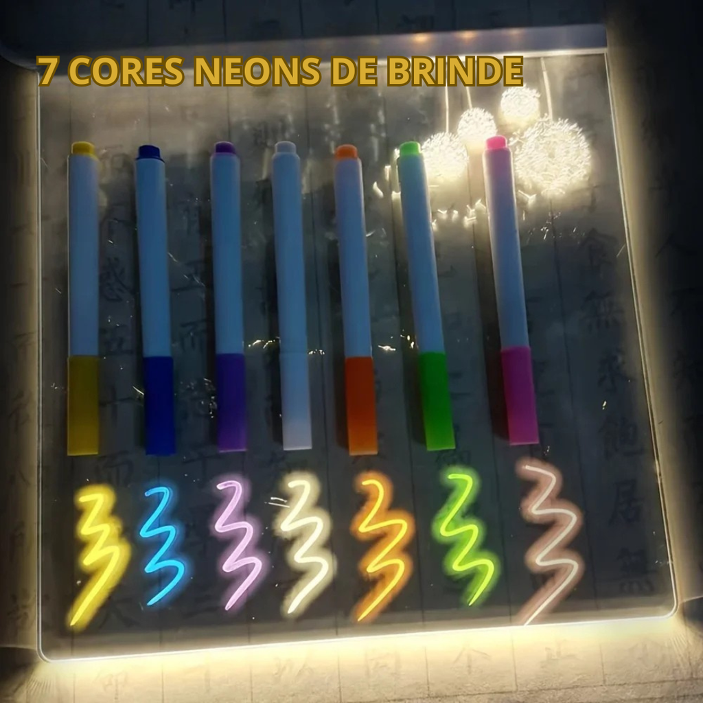 Ele vai desenhar, apagar, reinventar e se encantar com cada criação — tudo em um painel mágico de LED que dá vida às cores!
